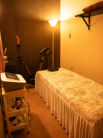 早速お店に入ると、待合室には季節のお花が飾られ、華やかな雰囲気でお出迎え!室内は控えめな光量の優しいライトで、仕事や寒さで疲れた身体をそっと包んでくれます。撮影しながら施術室もしっかりチェック。全部で6部屋あり、それぞれ落ち着いた装飾が施されていて安心感バッチリです。さらに新導入の電気マッサージ機が肩こりや腰痛に効くとのことで、さっそく体験してみたくなりましたぞ!